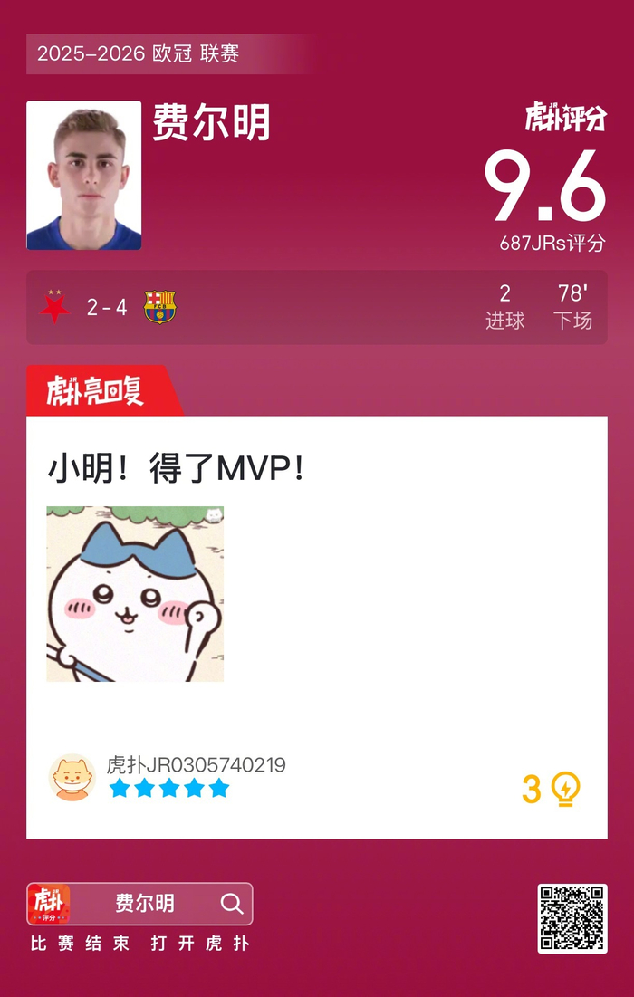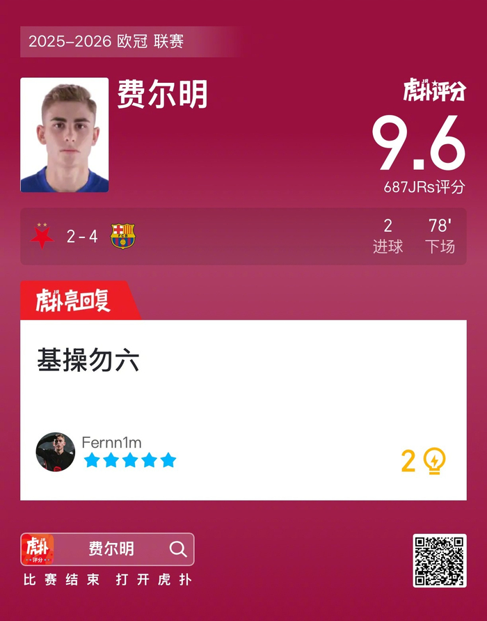 #布拉格斯拉维亚2比4巴萨#费尔明打进两球,赛后收获9.6的虎扑评分!